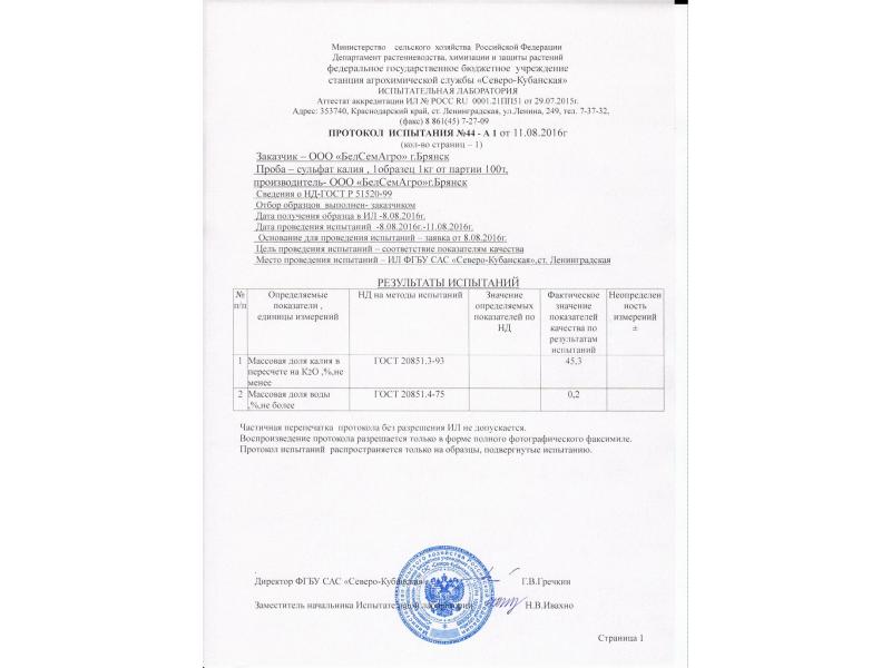 Наша организация занимается реализацией Сульфата калия марки «Технический». В данном продукте содержится калия более 45%. Кроме того в пересчете на действующее вещество К2SO4 составляет 85% что делает это удобрение наиболее ценным как для культур восприимчивых к хлору так и для всех остальных. Данный продукт производится в Республике Беларусь и является уникальным удобрением по своим свойствам, что подтверждается испытаниями проводимыми как лабораториями в Беларусии так и в России.